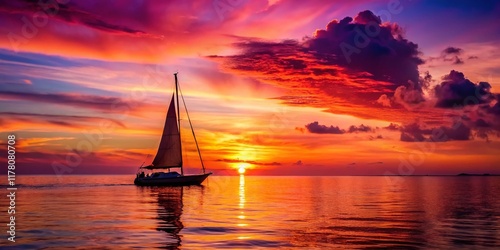Silhouetted Sailboat at Sunset, Pink and Orange Sky, Calm Sea, Romantic Vacation