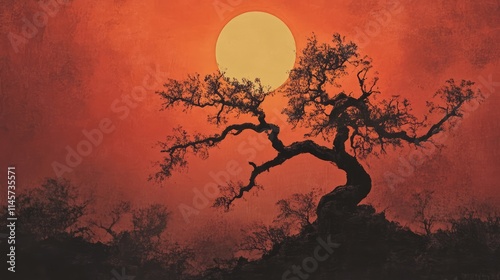 Silhouetted tree against a dramatic sunset sky creating a moody and atmospheric landscape scene