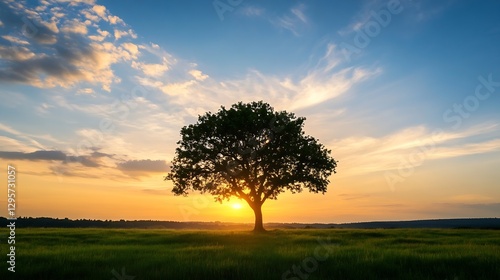 Silhouetted Tree Against Stunning Sunset Sky with Warm Colors : Generative AI