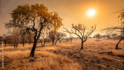 Silhouetted trees at sunrise create a vibrant orange and pink savannah landscape