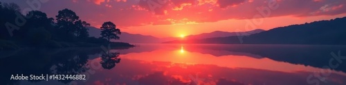 Silhouetted trees mirrored in still lake sunset , still water, eventide