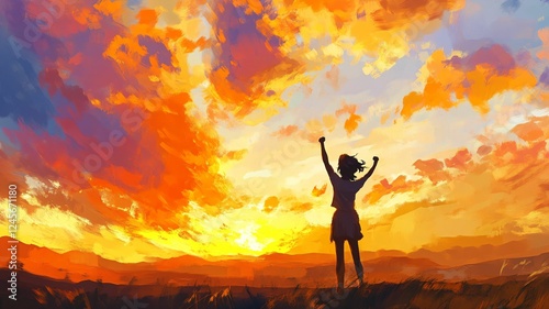 Silhouetted woman celebrates triumph bathed in the fiery hues of a breathtaking sunset sky