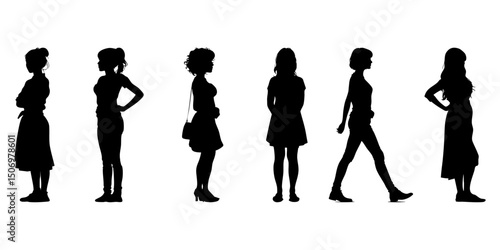 Silhouetted Women In Various Poses Icon Set. Female Posture And Fashion Representation Solid Symbol Collection. Design, Fashion, And Lifestyle Visuals. Isolated Vector Illustration