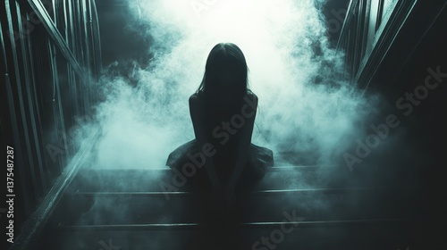 Silhouetted young female on smoky stairs in mysterious atmosphere