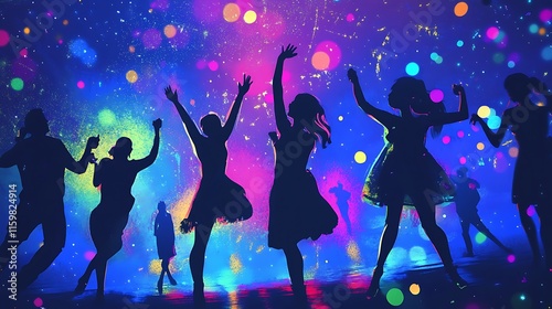 Silhouettes dancing against a vibrant, colorful background with a festive atmosphere.