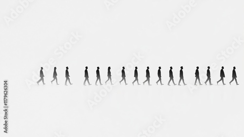 Silhouettes in Motion: A procession of figures walking in a hazy dreamscape, evoking themes of journey, isolation, and the rhythm of modern life.