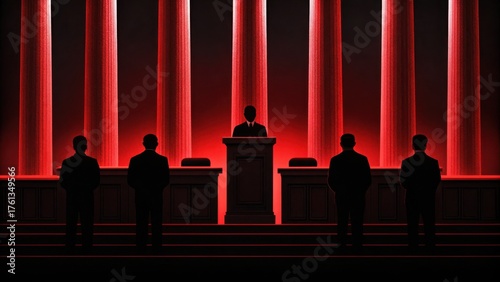 Silhouettes judges against backdrop concept. Silhouetted figures at a podium, dramatic red lighting in a solemn setting.