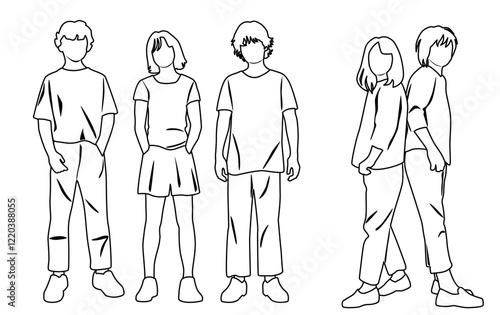 Silhouettes of boys and girls, group of standing children, vector, profile, linear sketch, hand draw, black and white color isolated on white background