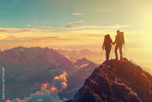 Silhouettes of a male and female hiker conquer a mountain peak, their hands intertwined in solidarity, epitomizing the spirit of exploration and companionship.