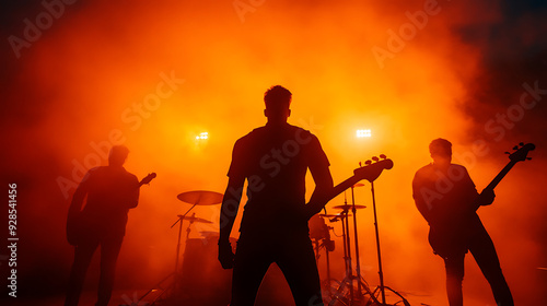 Silhouettes of a rock band performing on stage, bathed in orange light and smoke. AI generated