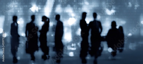 Silhouettes of business people in a city setting. Blurry figures against a background of binary code