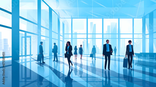 Silhouettes of business people in elegant suits walking in busy hall, going to their job. Vector illustration, tall city buildings silhouettes in the background