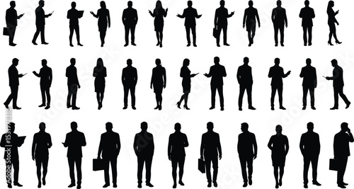Silhouettes of business people standing, walking, talking, and holding briefcases in formal outfits, isolated on white background for design