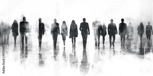 Silhouettes of Business People Walking. A composite artwork collage featuring silhouettes of business people walking forward, with a textured, blurred background.