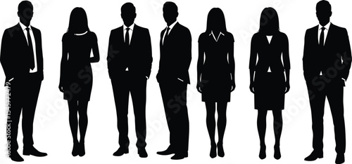 Silhouettes of business professionals, men and women standing together, front view group in corporate attire, black figures isolated on white background, vector illustration