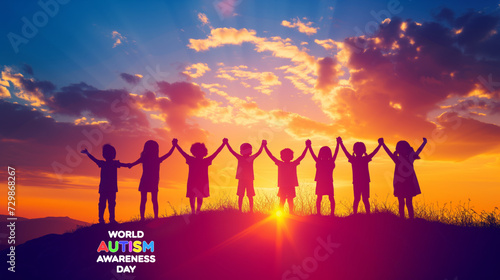 Silhouettes of Children Holding Hands on a Hill at Sunset Celebrating World Autism Awareness Day