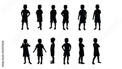 Silhouettes of Children Standing and Playing in Various Poses on White Background