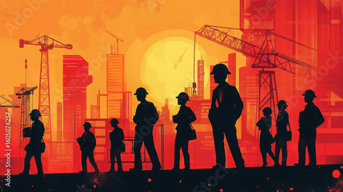Silhouettes of construction workers with city skyline and cranes against a sunset backdrop