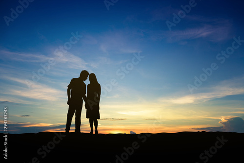 Silhouettes of couple man and woman in nature sunset background. Love concept.