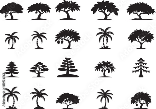 Silhouettes of Different Types of Tree Icon Set – Black Forest and Nature Tree Vector Collection.