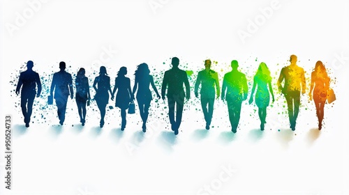 Silhouettes of diverse individuals walking together, representing unity, diversity, and collaboration in a colorful gradient.