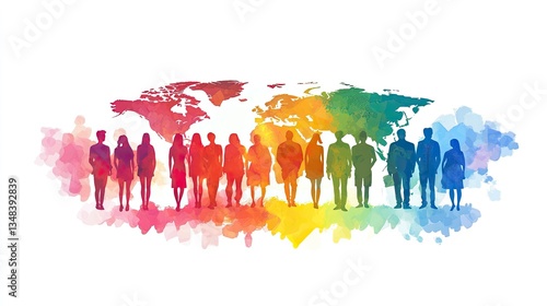 Silhouettes of Diverse People Standing on Colorful World Map Illustration