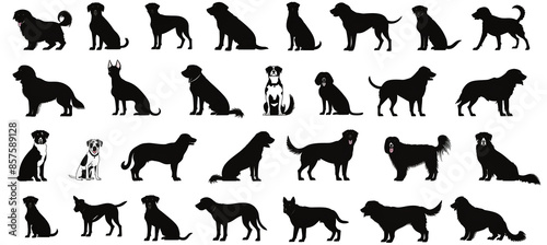 silhouettes of dogs on white background, The dogs are in various poses with happy expressions and are cute