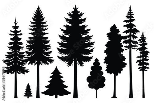 Silhouettes of evergreen trees in a forest setting