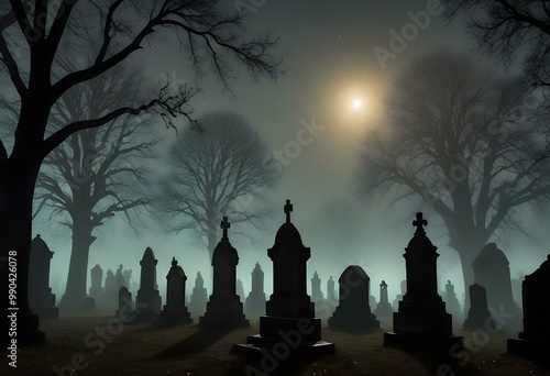 Silhouettes of gravestones in a foggy cemetery at night, with trees and a dark sky in the background