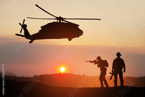 Silhouettes of helicopter and soldiers on background of sunset.