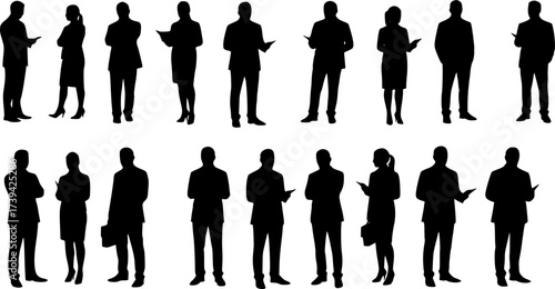 Silhouettes of men and women, a group standing business people, front and back view, profile, vector, black color isolated on white background