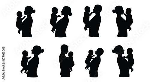 Silhouettes of mothers holding babies in various positions and poses