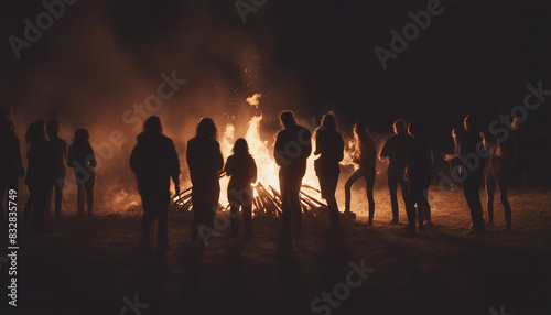 silhouettes of people having fun around a bonfire, sitting, playing guitar, chatting, sunrise