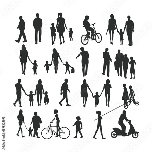 "Silhouettes of People in Various Poses – Walking, Standing, Talking, Urban Crowd, Vector Illustration"