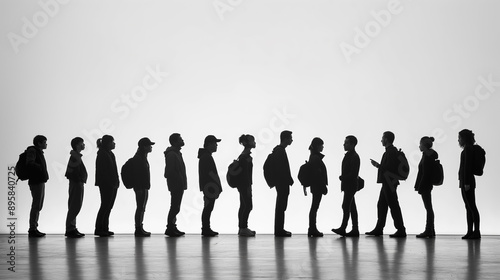 Silhouettes of people standing in a line, set against a white background, creating a minimalist and orderly composition.