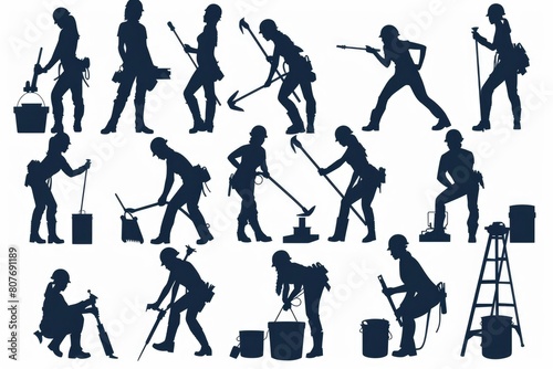 Silhouettes of people using various tools, suitable for industrial concepts