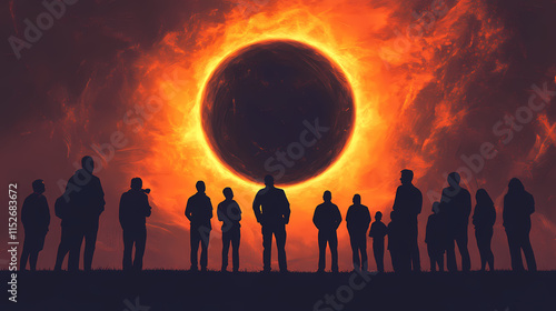 Silhouettes of people watching a total solar eclipse - generative ai. Eclipser. Illustration