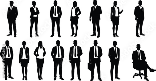 Silhouettes of professional business people, diverse team members, men and women in formal attire, standing and sitting in office poses
