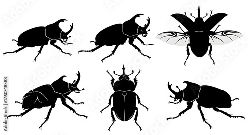 Silhouettes of rhinoceros beetles isolated on white background in various poses