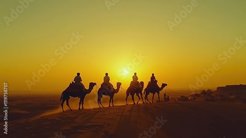 Silhouettes of riders on camels against a vibrant sunset in a desert landscape.