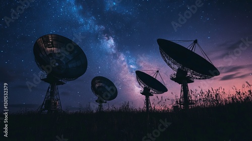 Silhouettes of satellite dishes or radio antennas against the night sky resembling a space observatory