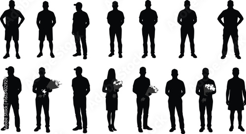 Silhouettes of standing people and individuals holding flower bouquets, casual and formal poses, diverse male and female figures
