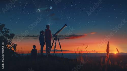 Silhouettes of three kids looking up at the night sky with a telescope.