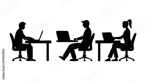 Silhouettes of three people working on laptops at desks in an office environment setting design
