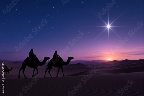 Silhouettes of Three Wise Men on camels crossing a desert under a starry sky with the Star of Bethlehem shining brightly at twilight. Ai generative