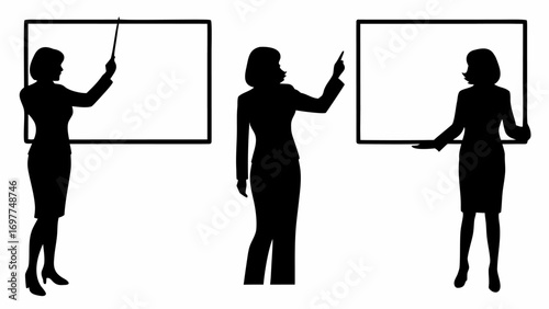 Silhouettes of three women presenting near whiteboards in a professional setting, black and white image | editable eps vectors