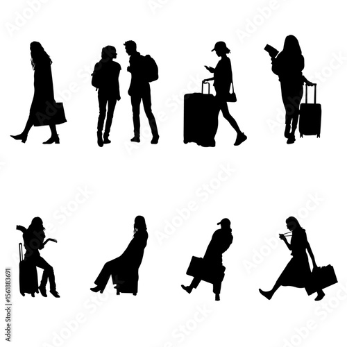 Silhouettes of travelers and pedestrians with luggage in various walking and waiting poses, ideal for travel infographics, airport wayfinding designs, and urban planning visualizations.