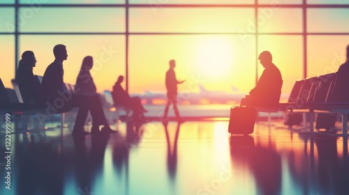 Silhouettes of travelers waiting at an airport terminal with a stunning sunset backdrop over the runway in the early evening, capturing a moment of anticipation and serenity