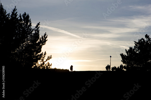 Silhouettes of trees and people on sunset sky background