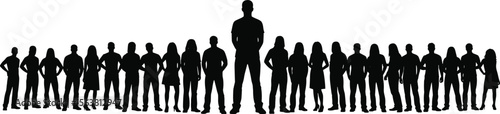 Silhouettes of twenty people in a line, one large central figure among smaller ones, black figures on white background, symbolizing dominance, unity, diversity, leadership
